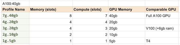 To give you a better sense as to what workloads will work best for different types of MIG devices we put together the table below.